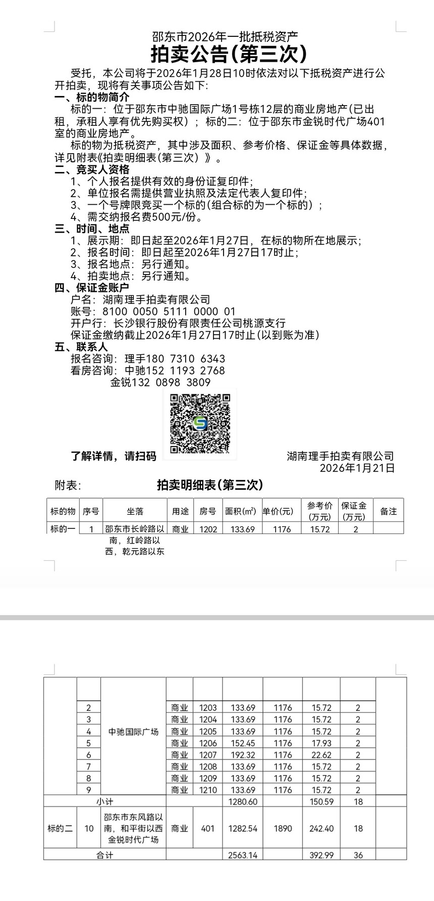 首页 >> 新闻中心 >>企业公告 >>拍卖公告 >> 邵东市2026年一批抵税资产 拍卖公告(第三次)