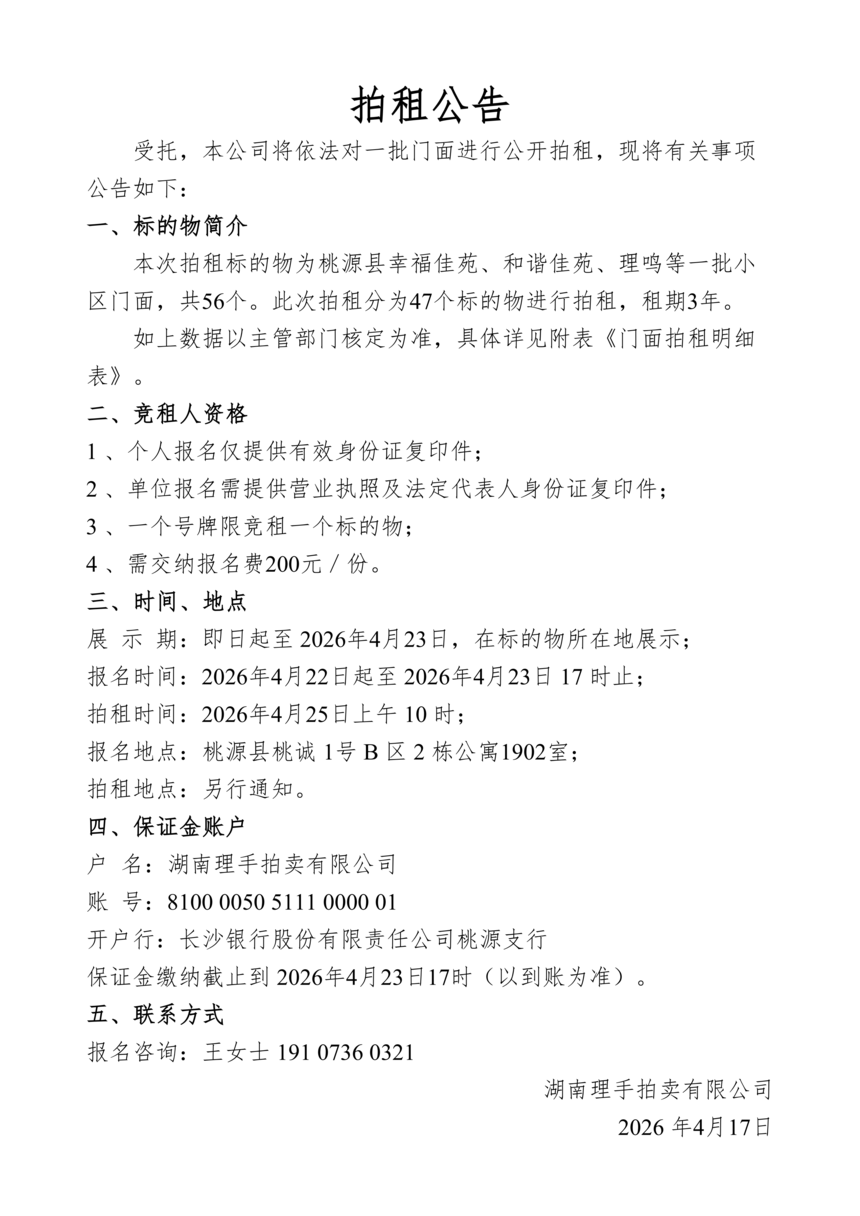 桃源县幸福佳苑、和谐佳苑、理鸣等一批小 区门面拍租公告